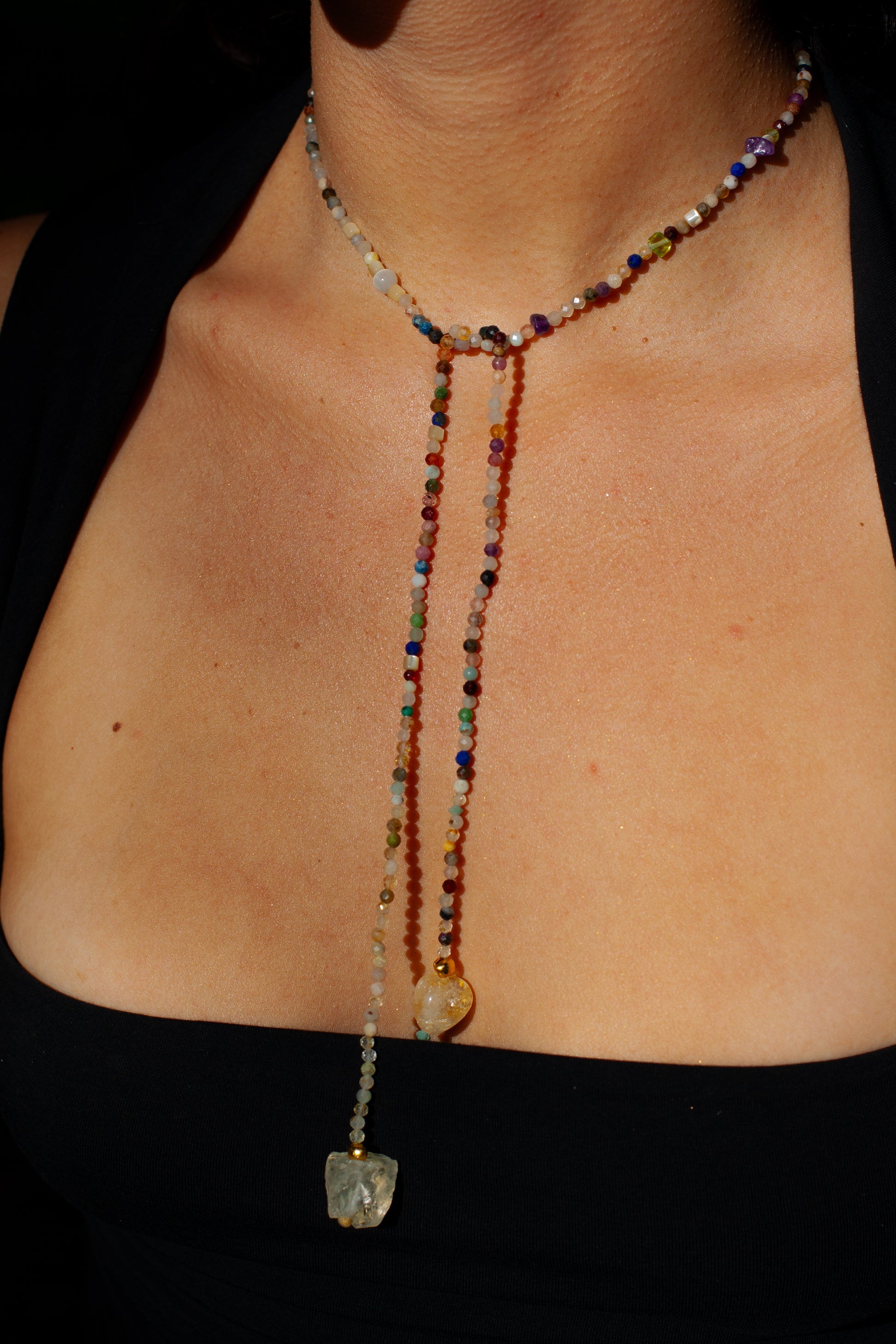 A radiant fusion of mixed crystals and a glowing Citrine centerpiece, this wrap necklace is designed to move with your energy. Citrine—the stone of abundance and joy—anchors the piece, while a mix of hand-selected crystals brings harmony, color, and intention to every strand.